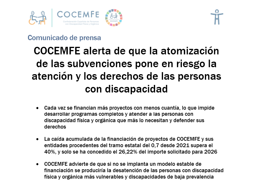 La Confederación Española de Personas con Discapacidad Física y Orgánica (COCEMFE) y sus entidades estatales denuncian que el sistema actual de subvenciones del tramo estatal del 0,7 está dificultando gravemente la atención y el acceso a derechos de las personas con discapacidad física y orgánica en todo el país. Así lo han expuesto tras la reunión celebrada este martes por el Órgano de Representantes de Entidades Estatales (OREE) de COCEMFE, donde se analizó la resolución provisional de la convocatoria del tramo estatal del 0,7 para 2026.